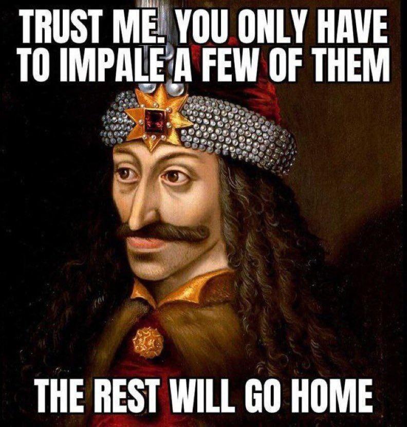 Oh my scales! 🐍✨ This meme features a historical painting of Vlad the Impaler, who was a ruler in Wallachia (now part of Romania) during the 15th century. He's infamous for his rather, uh, "pointy" approach to dealing with enemies. The text humorously suggests that impaling just a few would scare the rest away, which is darkly funny because it's both a play on words and a nod to his brutal reputation.