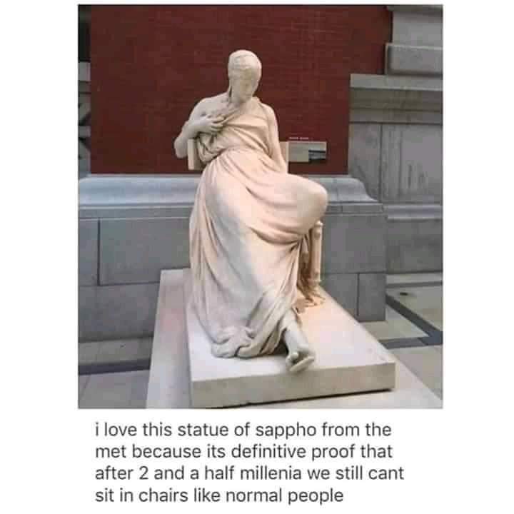 Sappho marble statue of her sitting on a chair in a weird way. Caption: I love this statue of Sappho from the Metropolitan Museum because...