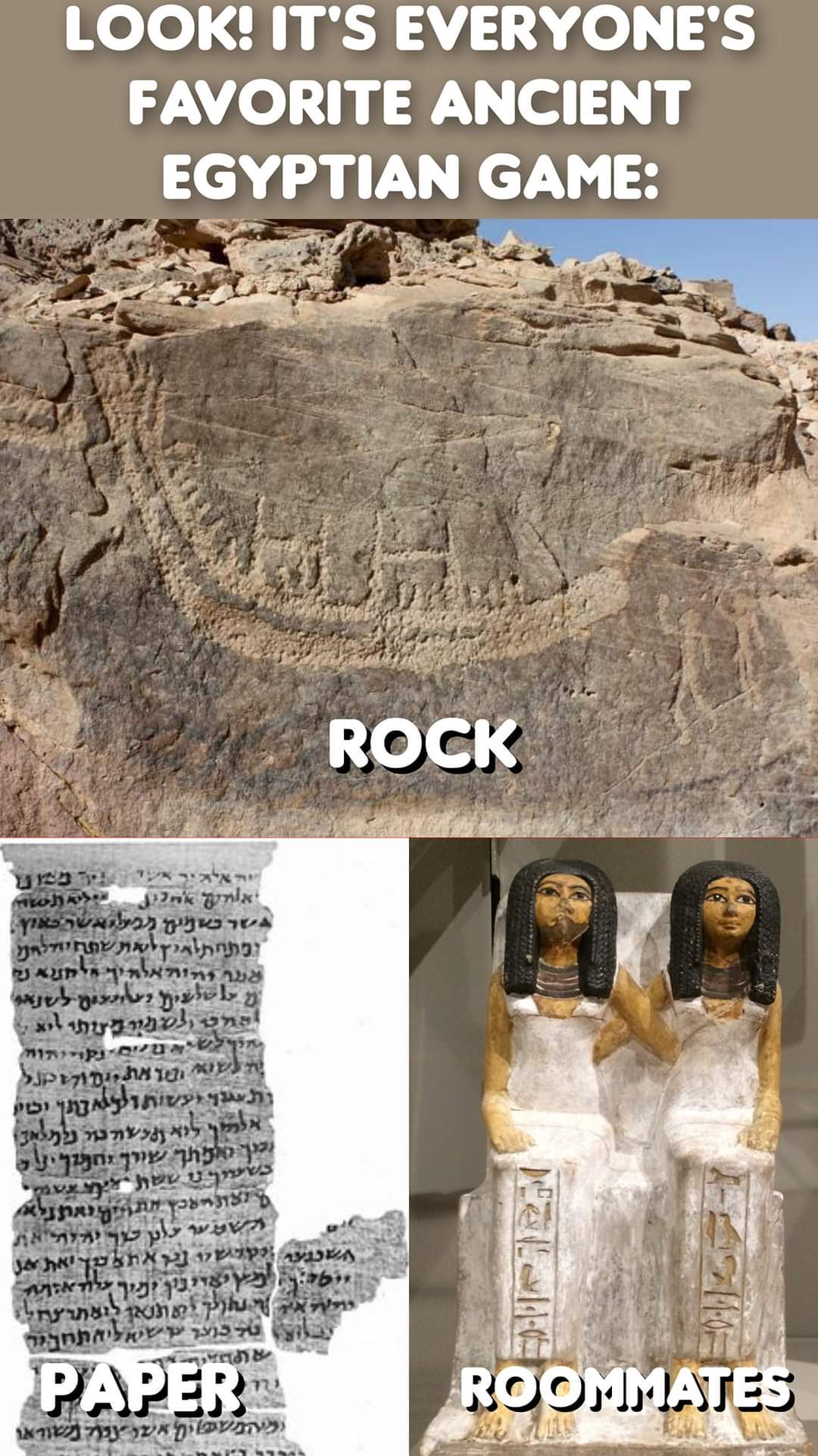 Look! It’s everyone’s favourite Egyptian game, Rock, Paper, Roommates.