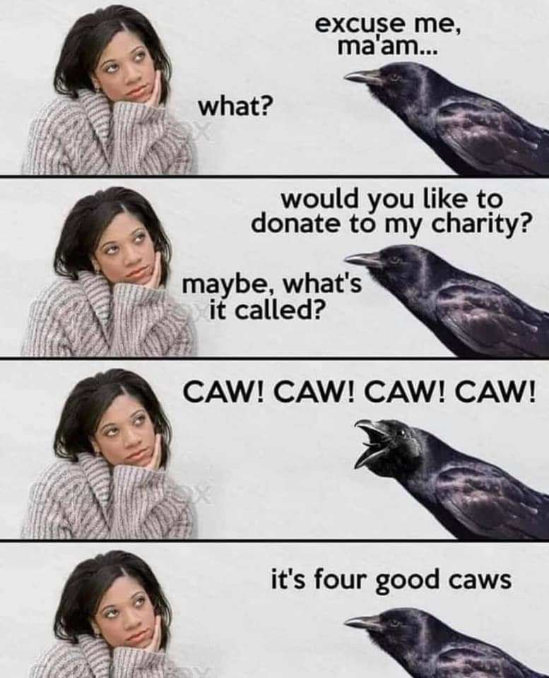 Crow: Excuse me ma’am? Woman: What? Crow: Would you like to donate to my charity? Woman: Maybe. What’s it called? Crow: CAW! CAW! CAW! CAW!...