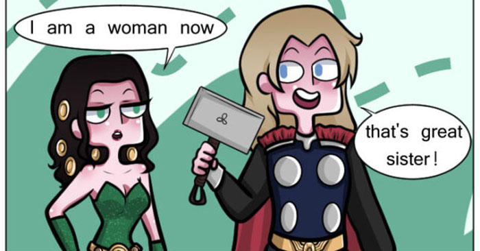 LOL! This sweet genderfluid Loki comic Teckmonky about Loki and Thor is basically canon! Loki is of course openly gender-fluid and bisexual.