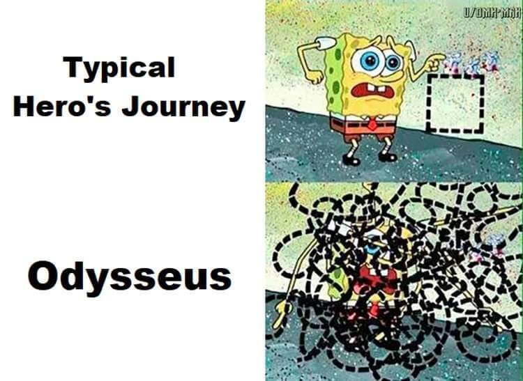 Typical Hero’s Journey: Clean square route. Odysseus: A tangled mess of a route.