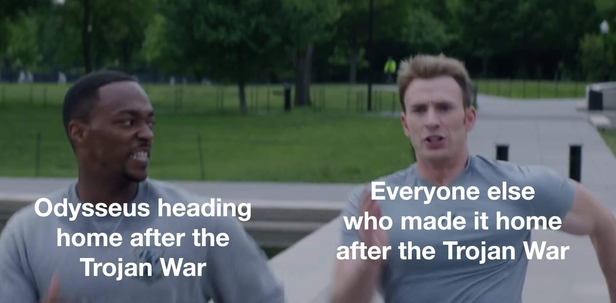Odysseus heading home after the Trojan war. Captain America overtaking him: Everyone else who made it home after the Trojan War.