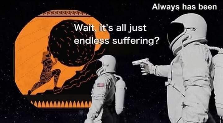 Sisyphus pushing the boulder up the hill. Astronaut 1: Wait, it’s all just endless suffering? Astronaut 2: Always has been.