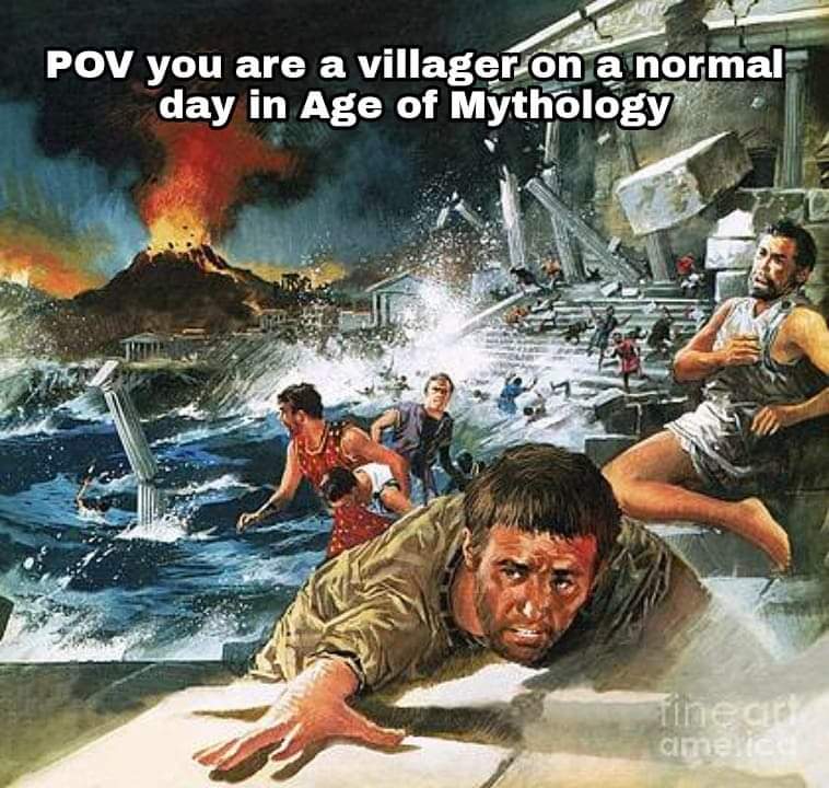 Illustration of the apocalyptic moment in Pompeii, people drowning in waves, buildings collapsing. Caption: Point of view, you are a villager on a normal day...